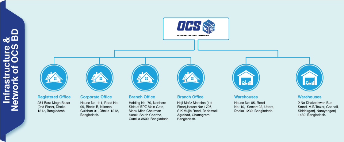 OCS Bangladesh operates a dedicated warehouse at Hazrat Shahjalal International Airport in Dhaka, enabling the efficient handling of time-sensitive international shipments. The company also maintains a strategic presence with offices and warehouses across key commercial and industrial regions.