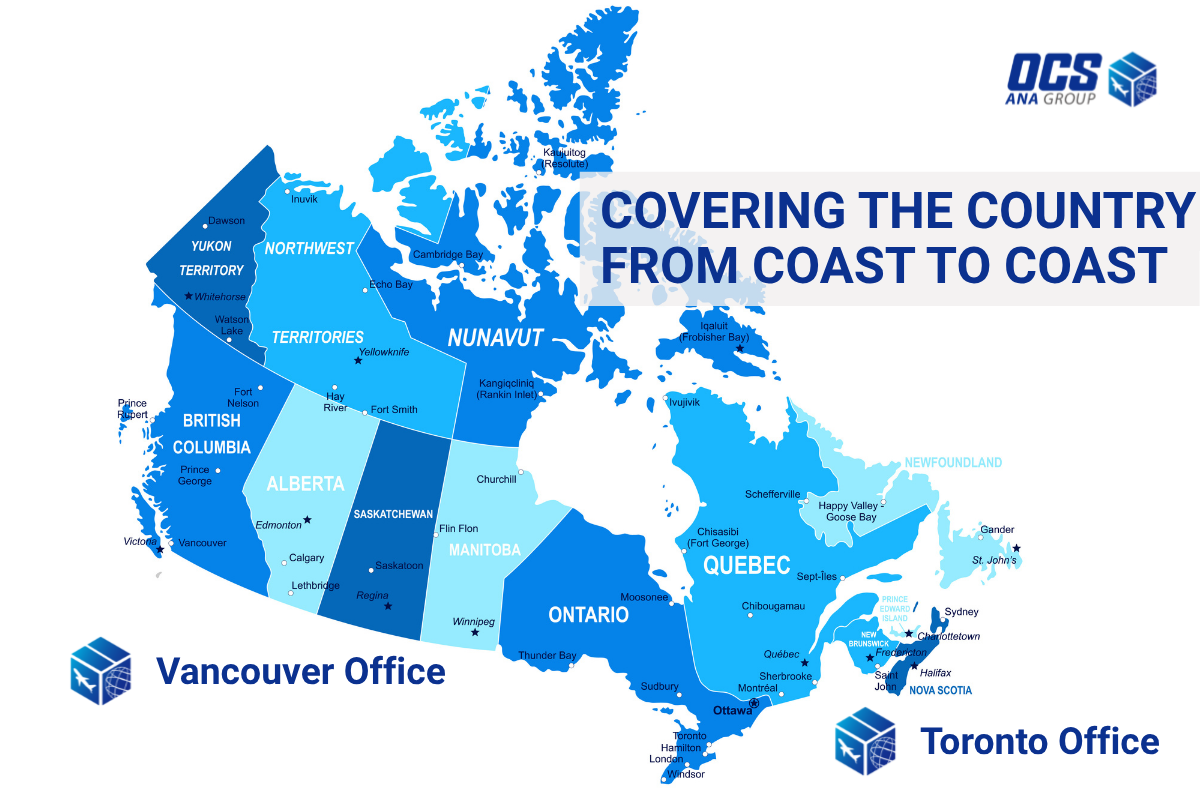 OCS first established operations in Canada in 1963, starting in Vancouver as a hub for shipments and publications from Japan to Central and South America. This was OCS's first pulse in the country. Decades later, OCS Express Ltd. took the helm in 2008 to manage all OCS business in Canada. Today, OCS Canada operates out of two main offices in Vancouver and Toronto, covering the country from coast to coast. They also have a strong network of agents in most major cities. This extensive reach allows OCS Canada to serve over 99% of the populated areas across the country.